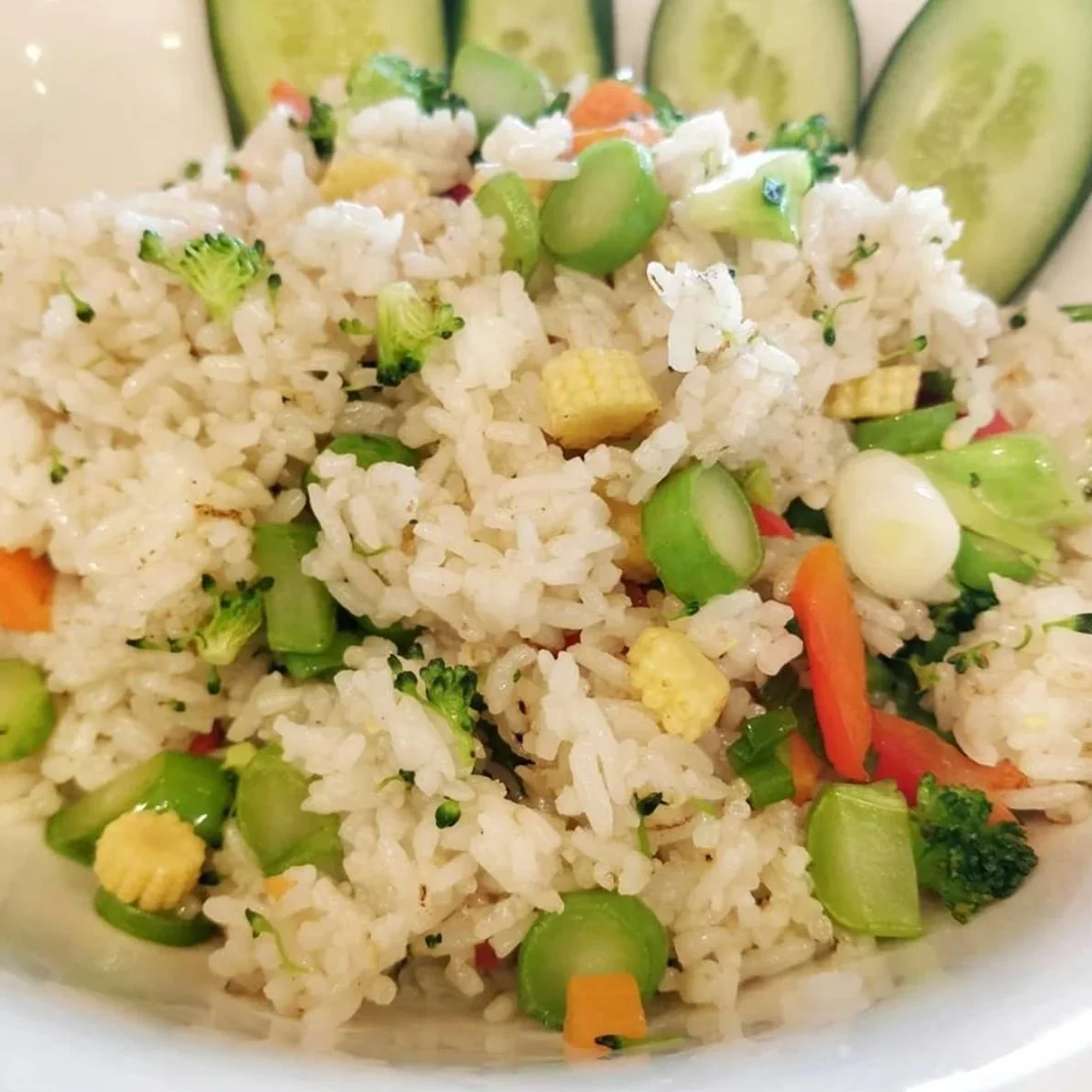 Fried rice with Chinese sausages, white chicken breast, organic egg, and diced greens.