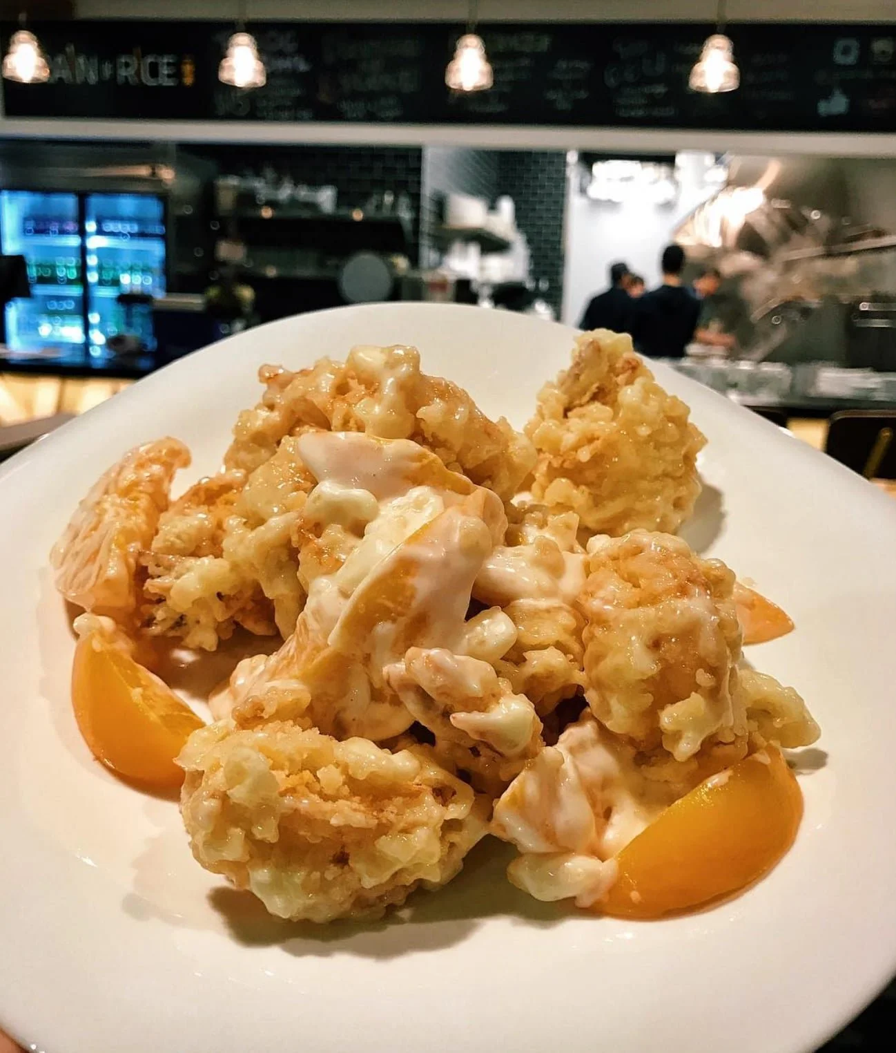 Peach sauce tossed with crispy tempura shrimp. The perfect sweet and savoury combo.