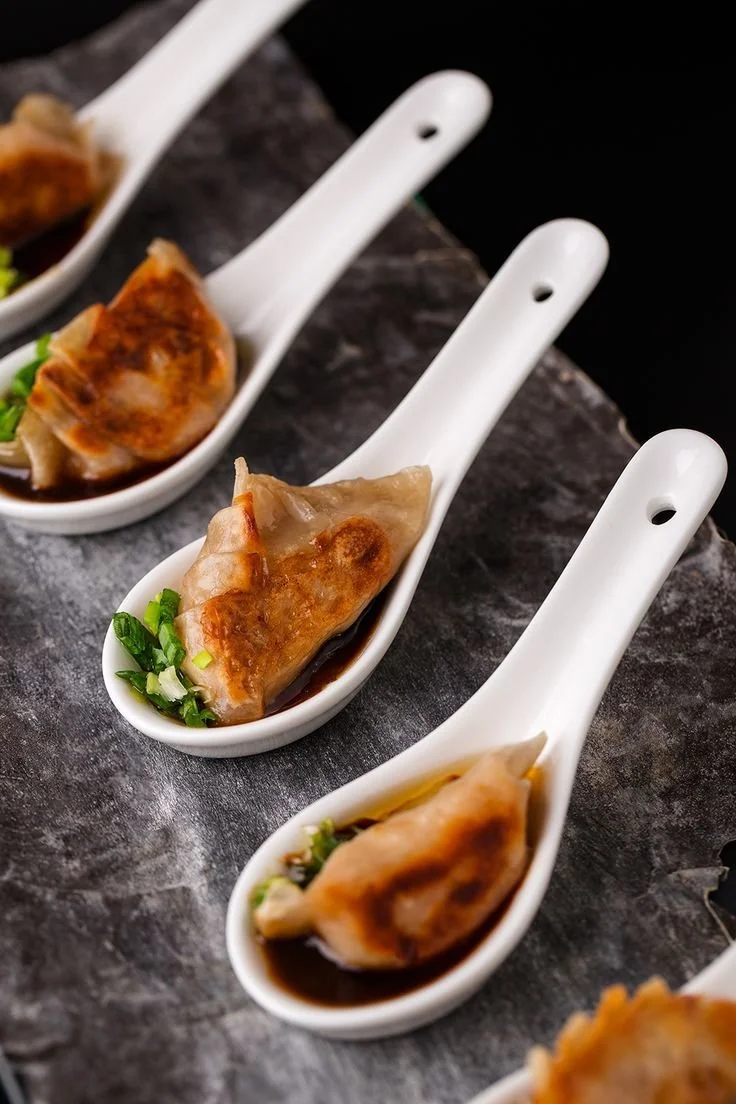 Crispy Gyoza: Pan-seared pork or veggie dumplings on bite-sized sticks